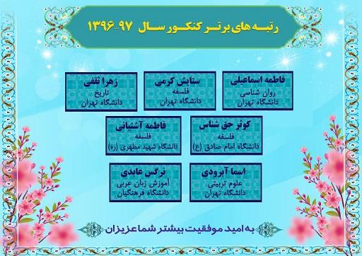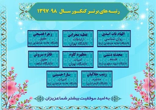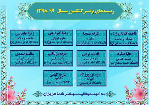 نتایج چشمگیر دانش آموزان عزیزمان در کنکور سراسری بیانگر لطف خداوند متعال در قبال تلاش و مجاهدت شبانه روزی دانش آموزان، پدران و مادران عزیزشان و همه دستاندرکاران مدرسه بوده است و باید به خاطر این نعمت خداوند متعال را شکر کنیم. نعمت بزرگتر اما جوانان برومند و صالح و با ایمانی است که مایه افتخار خانواده ها و مدرسه بوده و امید آینده انقلاب هستند و انشاءالله سربازان رکاب حضرت ولیعصر ارواحنافداه خواهند بود.